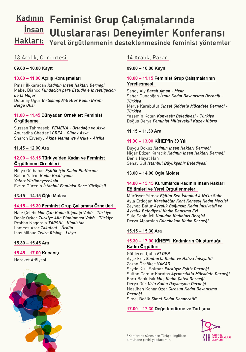 Kadının İnsan Hakları Derneği (KİH) olarak, feminist grup çalışmasının kadınların birlikte düşünme, dayanışma kurma, örgütlenme ve toplumsal dönüşüm yaratma mücadelemizdeki yerini tartışmak üzere Kadının İnsan Hakları: Feminist Grup Çalışmalarında Uluslararası Deneyimler Konferansı’nı düzenliyoruz. KİHEP’in 30 yıllık feminist birikiminden hareketle, farklı ülkelerden ve topluluklardan feminist örgütleri, araştırmacıları ve aktivistleri İstanbul’da bir araya getiriyoruz.